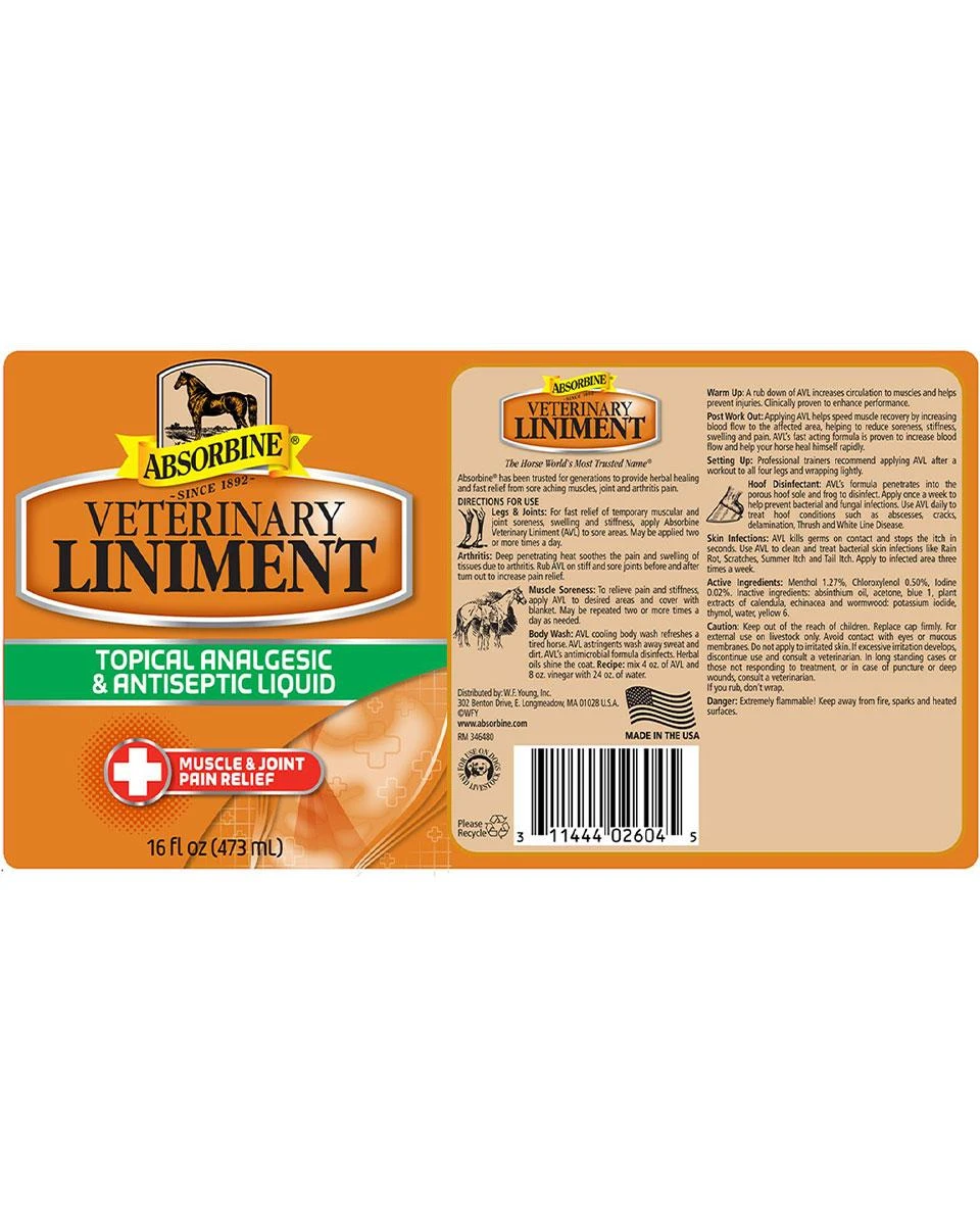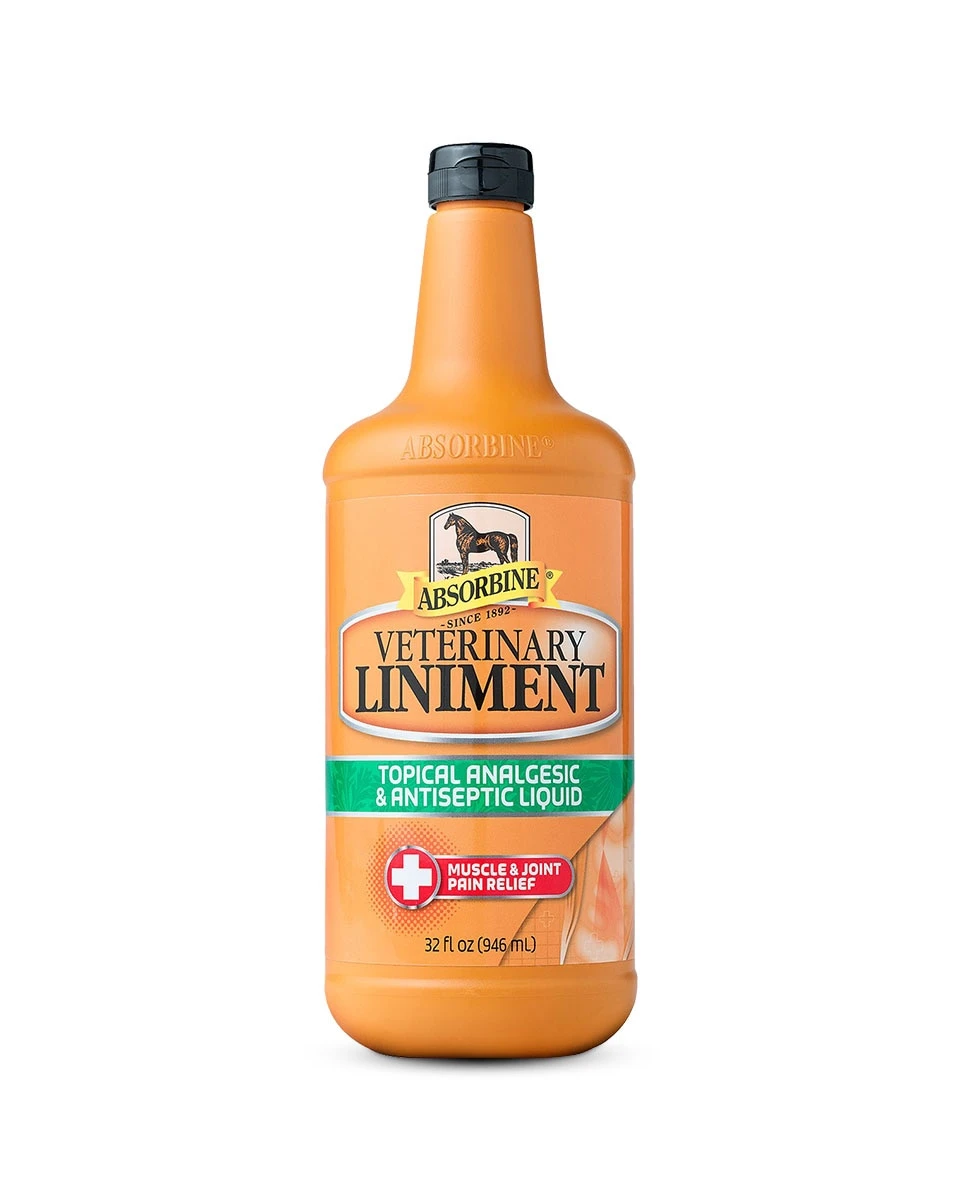 Absorbine’s Veterinary Liniment has been one of the top selling brands of liniment for over 120 years. It contains a blend of natural herbs and oils to provide a warm soothing treatment for the temporary relief of muscle soreness. Liniment in general is a mild stimulant to the circulatory system, improving blood flow to help fatigued muscles, tendons and joints to normal. Absorbine’s Veterinary Liniment can be used pre or post workout, or as an antiseptic for minor cuts, abrasions and insect bites. It is safe to be applies full strength or with water and vinegar as a body wash.