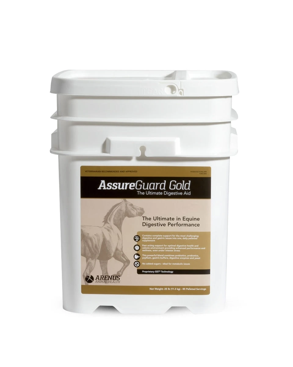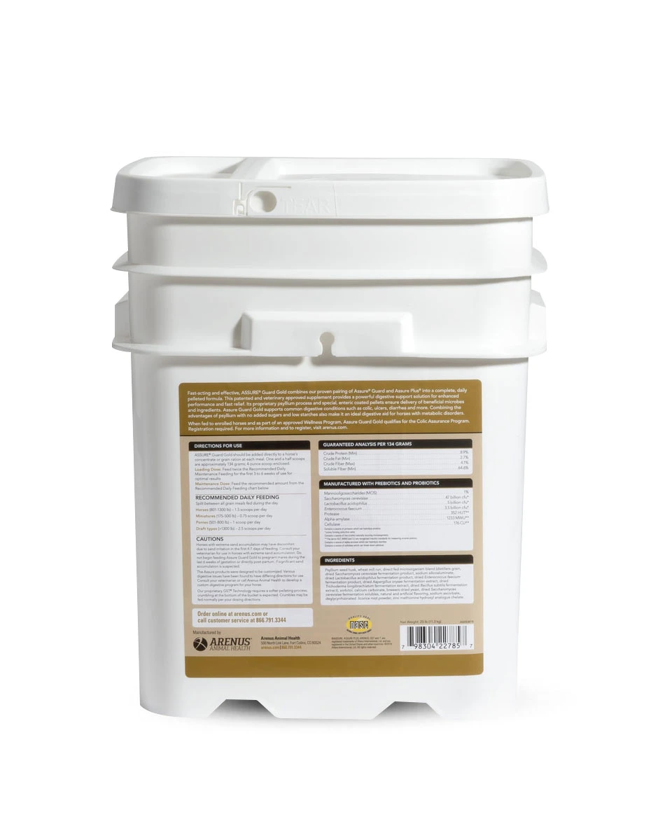 Assure Guard Gold by Arenus is one of the most complete digestive supplements on the market. This formula is a blend of Assure Guard and Assure Plus in one easy to give pelleted supplement. Its main components are probiotics, prebiotics and psyllium. Probiotics add good bacterial into the gut, prebiotics help to feed the good bacteria and psyllium helps to move sand out of the digestive tracts as well as promoting overall digestive health and regularity.Â