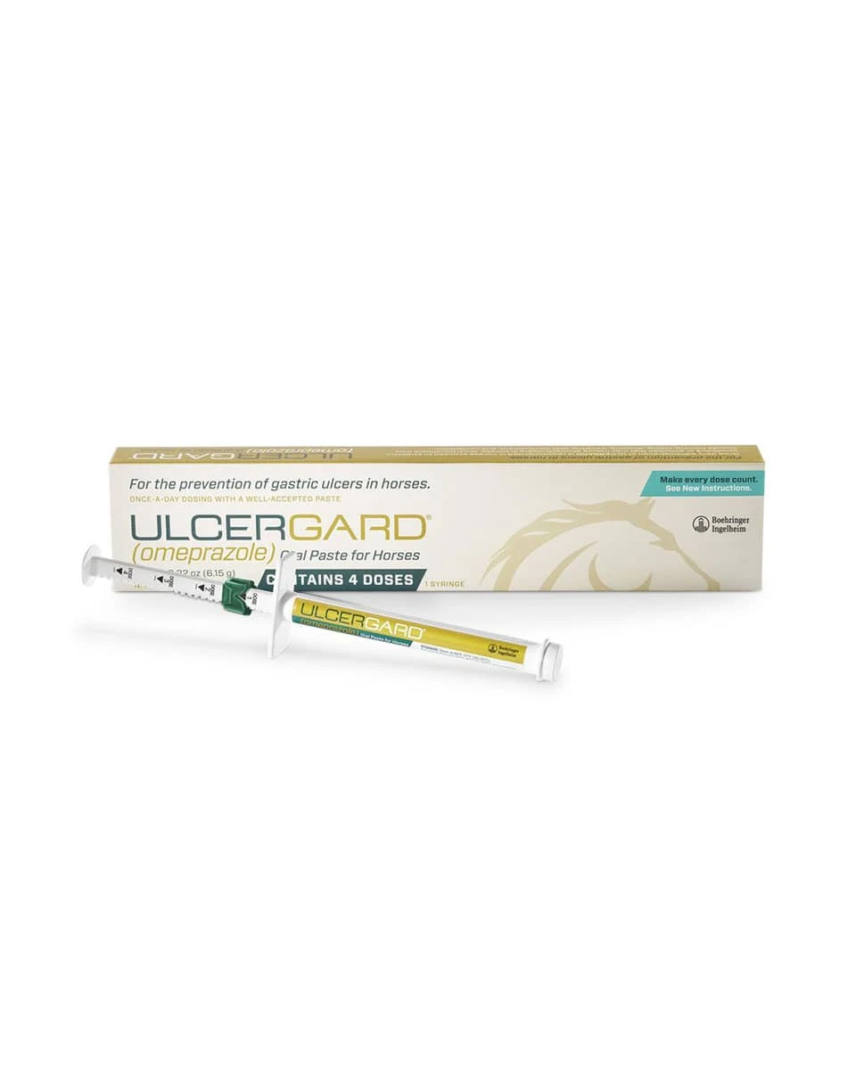 Ulcergard (Omeprazole Paste) from Boehringer Ingelheim helps prevent the formation of gastric ulcers in horses. Stress can cause your horse to produce more gastric acid. Stressful events, like traveling, shows, or intense exercise, can make your horse uncomfortable or worse. Ulcergard can help with these symptoms and keep your horse happy!