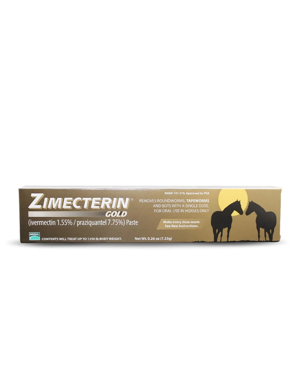 Zimecterin Gold by Boehringer Ingelheim combines two active ingredients – ivermectin and praziquantel to provide the most comprehensive parasite control available for horses. This dewormer has the ability to eliminate up to 61 species of equine parasites and tapeworms. Each 7.35 g tube of Zimecterin Gold treats horses up to 1,250 lb.Â