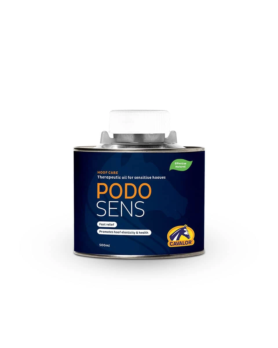 Cavalor PodoSens is a therapeutic oil for horses with sensitive hooves. It contains a blend of essential oils that provide quick relief while also providing support for optimum hoof growth, elasticity, and overall health. It is great for use on sensitive or problem hooves, as it provides both immediate and lasting relief. Applied to the sole and coronet band, PodoSens improves the elasticity of the hoof wall. This allows for proper growth of the hoof, which in turn reduces sensitivity and stimulates blood flow.