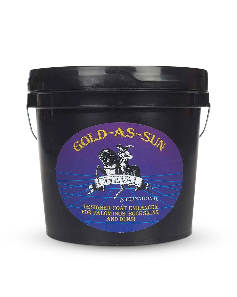 Gold-as-Sun Show Formula horse supplement by Cheval International helps enhance highlights in Palominos, Cremellos, Buckskins, Duns, and golden horses. This specially formulated formula brings out the brilliant gold undertones and is safe to feed during showing. Outside of enhancing highlights, this supplement can also help strengthen hooves and could eliminate horseshoes and biotin.