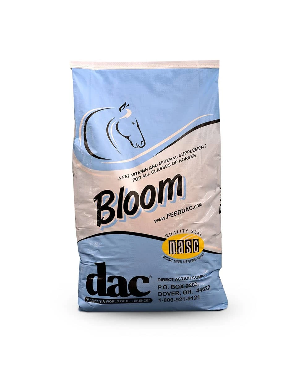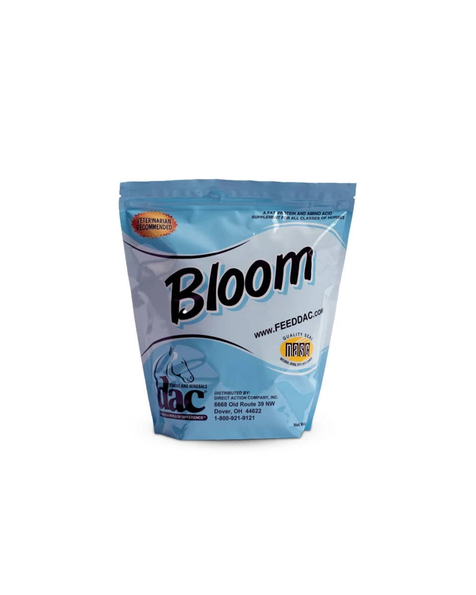 Bloom by dac is a feed-through supplement that is designed to deliver healthy fats, vitamins, and minerals to all classes of horses. Bloom helps to promote healthy weight gain as well as skin and coat health. This unique formula contains Cool Calories 100, which is a highly concentrated powdered vegetable fat that can provide your horse with additional calories without making them ‘hot’.Â