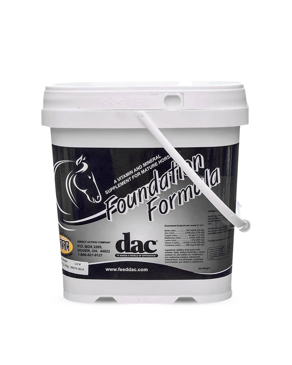 Foundation Formula with Biotin Supplement by dac provides your horse with the nutrients they need to grow and develop healthy hooves inside and out. This supplement helps horn and frog quality, hoof integrity, and strength throughout the hoof.
