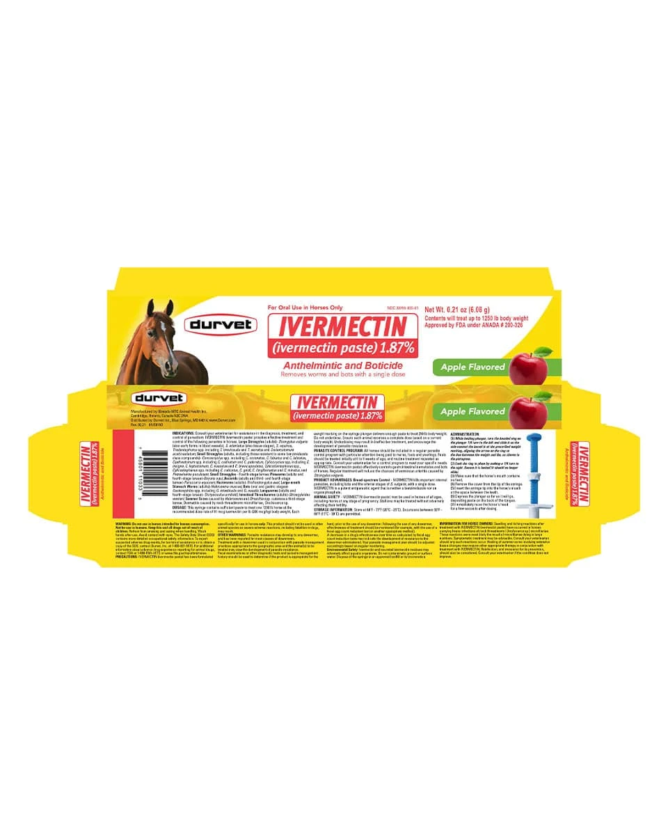 Durvet Ivermectin Paste 1.87% wormer for horses combats large strongyles, bots, small bloodworms, threadworms, roundworms, large mouth stomach worms, lungworms, and pinworms. The apple flavor makes this treatment more palatable and easier to give. Each syringe contains enough to treat a horse that weighs up to 1,250 lbs, and is safe for use in breeding stallions, pregnant mares, and foals when used according to the instructions or by the direction of your veterinarian. Â