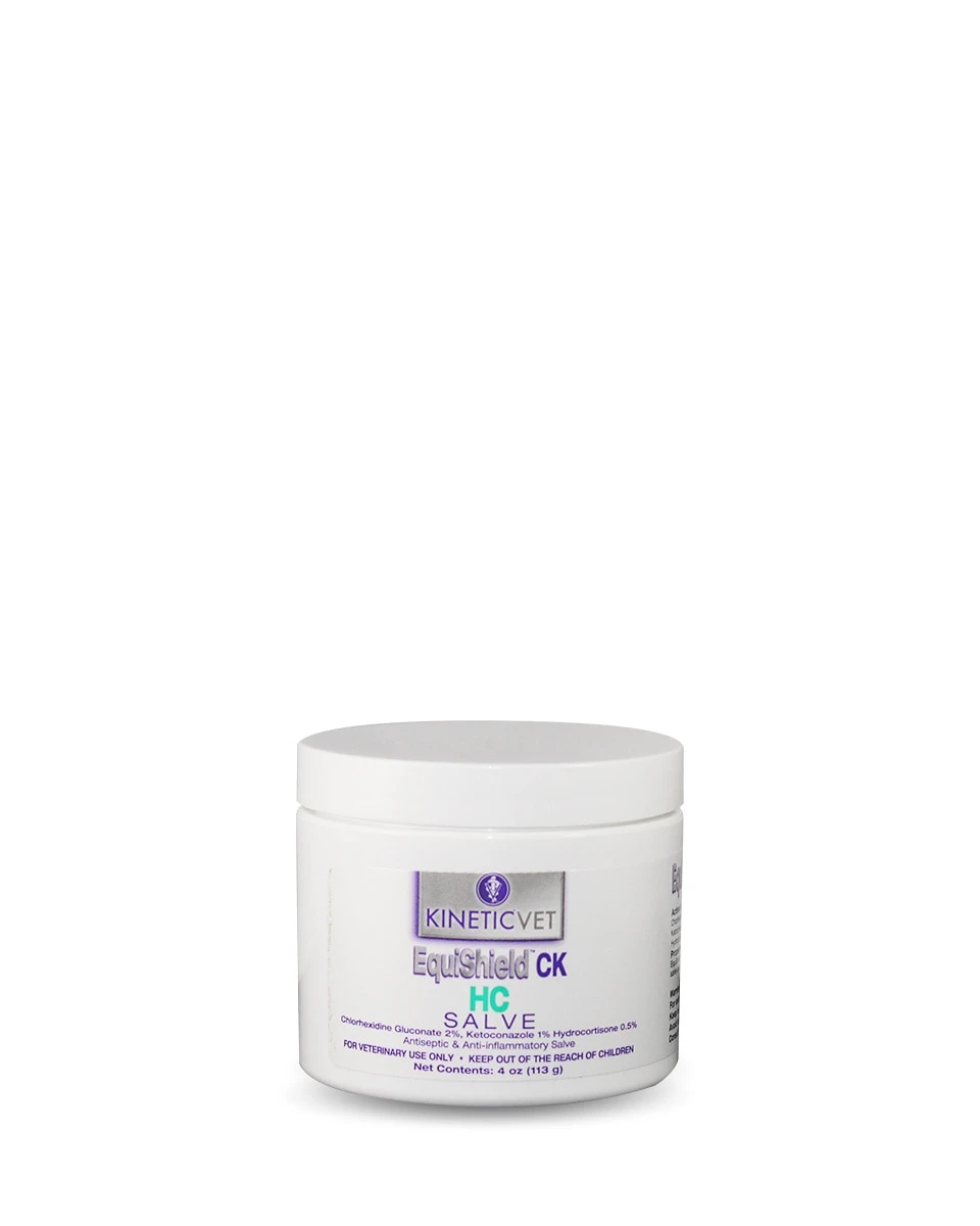 EquiShield CK HC Salve by Kinetic Vet is a medicated topical salve used for the treatment of skin conditions such as bacterial dermatitis in horses, dogs and cats. EquiShield CK HC Salve is anti-inflammatory and antiseptic with active ingredients chlorhexidine, ketoconazole and hydrocortisone. It also contains lanolin to moisturize while the treated skin is healing.Â