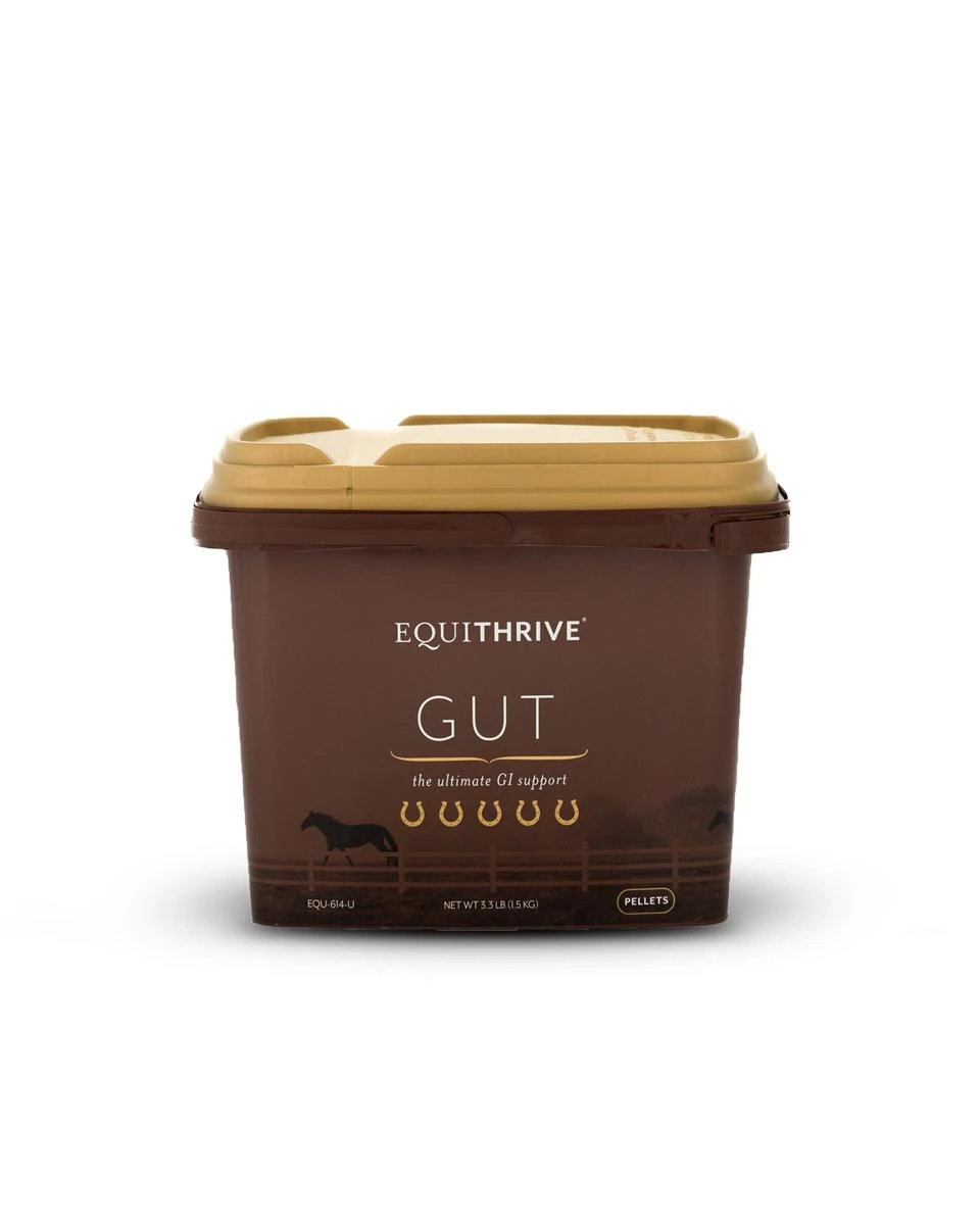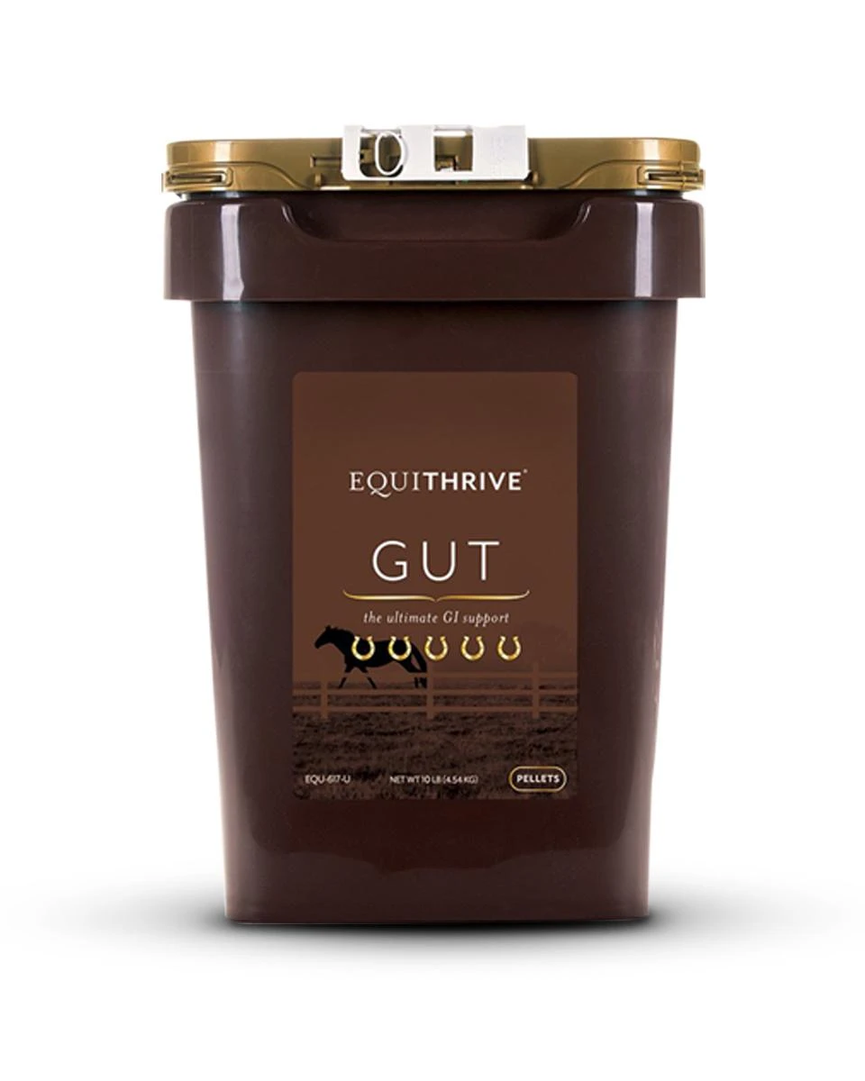 Equithrive Gut Pellets are specially formulated to target the foregut through hindgut, or GI area, of the horse’s digestive system. Pro and prebiotics promote healthy gut bacteria populations, especially during periods of increased stress or antibiotic treatments. Gut Pellets also contain pH balancing ingredients to help maintain GI health and support digestibility. This supplement comes in a palatable pelleted formula and contains micro-encapsulated ingredients to improve absorption.Â