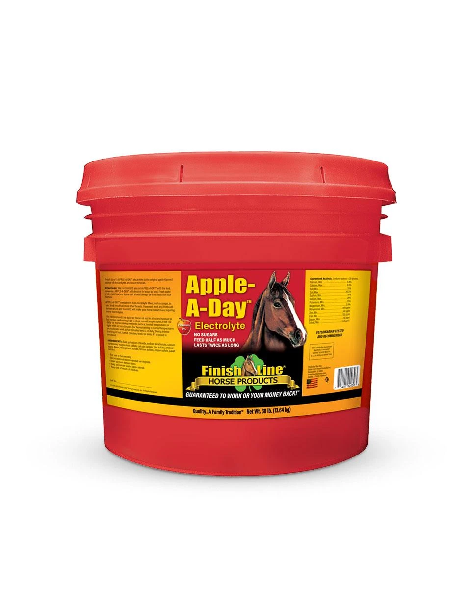 Apple-A-Day prevents dehydration, replenishes electrolytes, and  aids in appetite and water consumption. There are no sugars or dyes in the product. Contains a unique apple flavor that horses love. Apple-A-Day is cost effective, just feed 1 oz. daily.