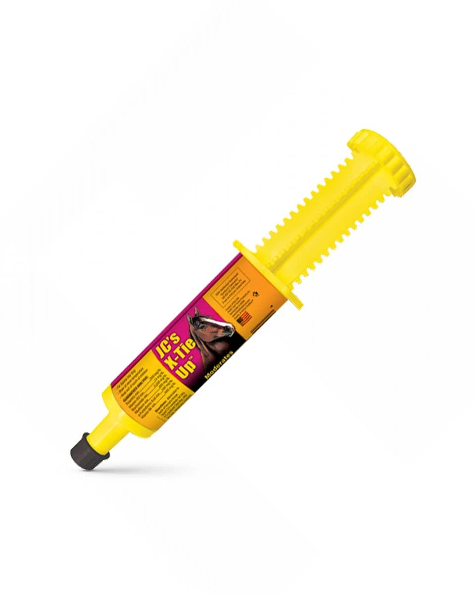 JC’s X-Tie Up from Finish Line is an oral paste that offers muscle support for horses who suffer from cramps and episodes of exertional rhabdomyolysis (tying up). Use preventatively or during an episode to provide quick relief to your horse; the JC’s X-Tie Up will support healthy muscle function for up to 1 month after use. Each tube includes 3 doses of a proprietary blend of vitamins and has no side effects.Â