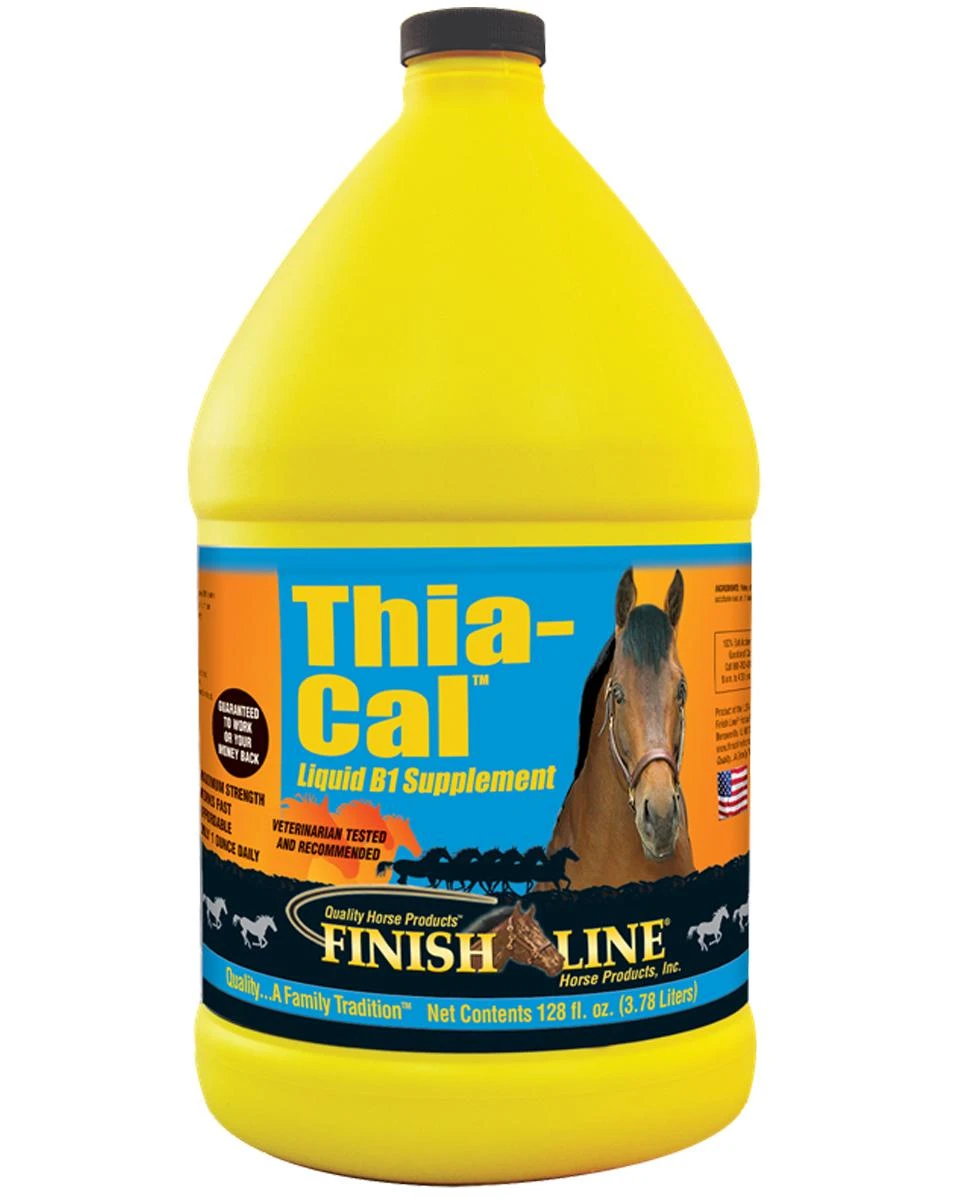 Thia-Cal calms nervous horses and will not test. Many nervous habits can be attributed to nutritional deficiencies. Deficiencies of Thiamine, or Vitamin B1 are the most common causes of nervous behavior. Horses in need of Thiamine will often act irrationally, have trouble keeping weight on and be unfocused in competitions. Thia-Cal is a very palatable liquid formula that contains 500mg/oz of pure Thiamine along with calcium, magnesium, potassium, chloride and sodium.Â
