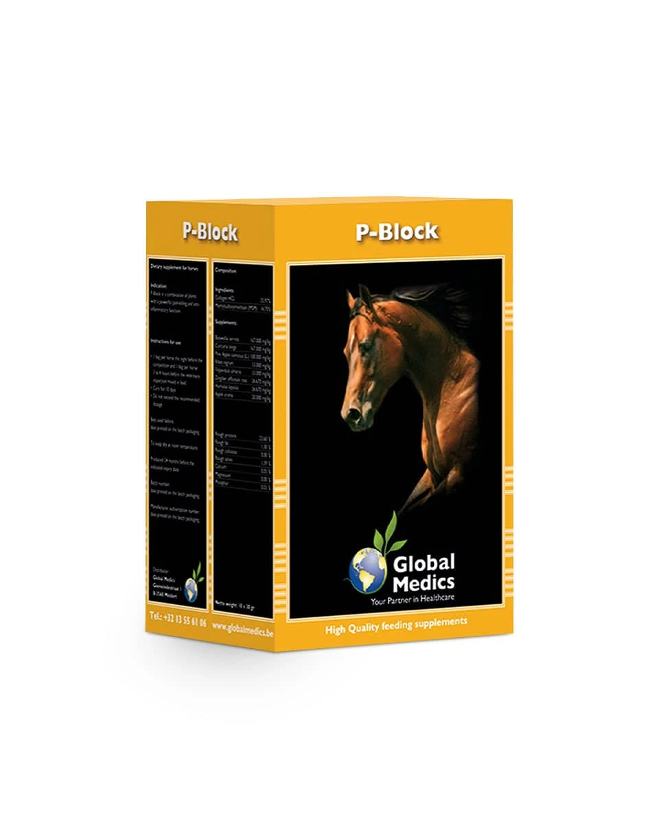 Global Medics P-Block Powder contains a unique mixture of herbs and antioxidants that provide strong analgesic effects for hard-working joints and muscles. P-Block is formulated specifically to provide relief and comfort to your horse on competition days to be sure they can perform at their best. This formula containing Boswellia Serrata, Curcuma Longa, and Pineapple Comosus is fast-acting and powerful with no doping substances, making it the perfect addition to your pre-showing routine.Â