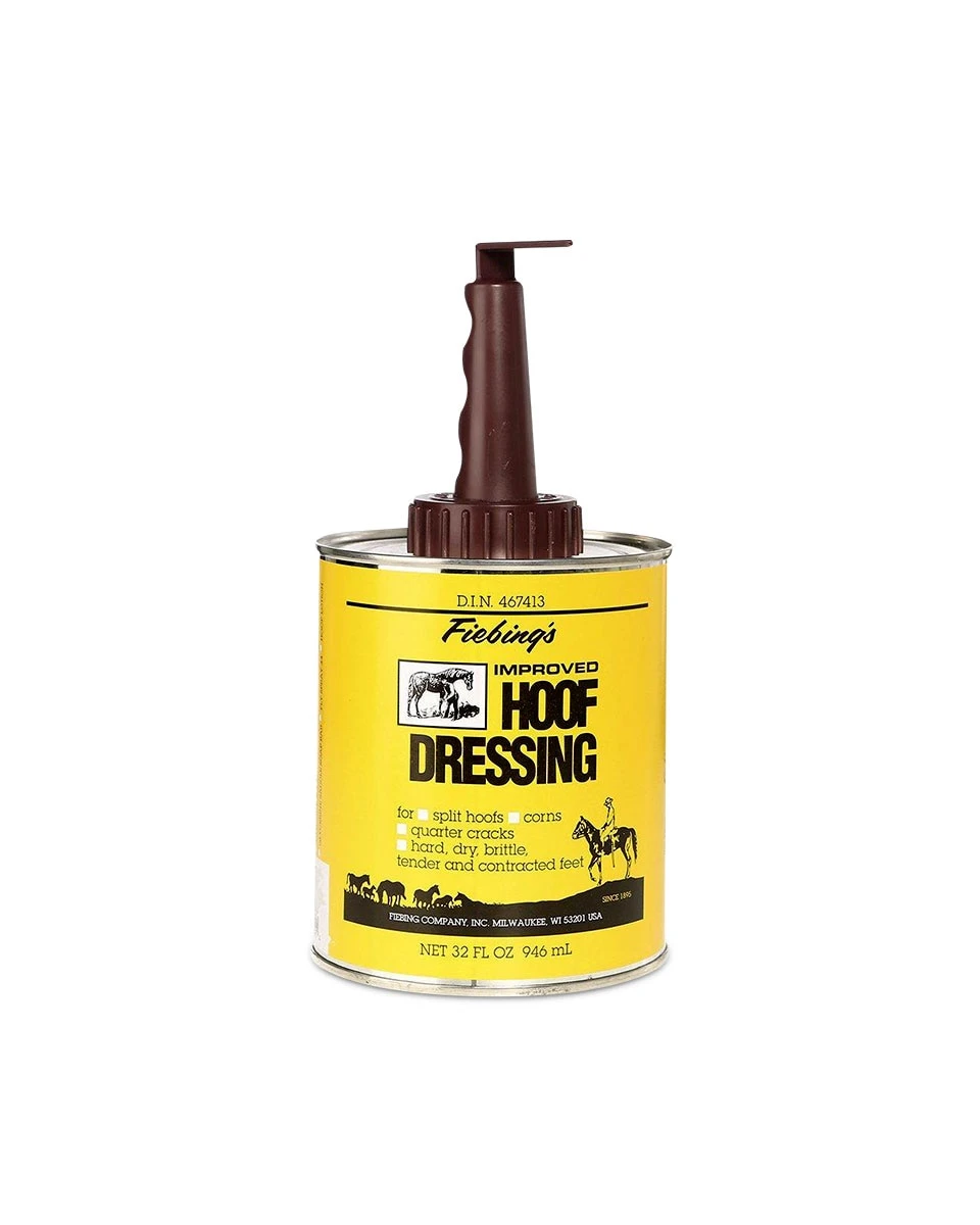 Fiebing’s hoof dressing has been used in the United States since 1895 to treat corns, quarter cracks, split and brittle hooves. This liquid dressing imparts a semi-gloss finish to hooves and aids in keeping the hoof healthy. Mineral oil, soy oil, gilsonite, and less than 1% cresol complex added as a preservative. Â