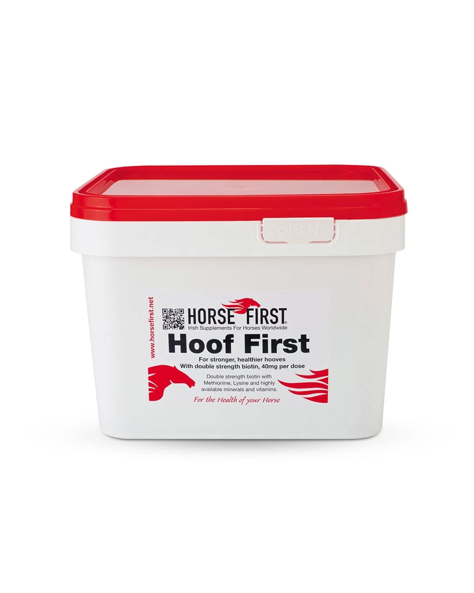 Hoof First from Horse First is a unique supplement that blends double-strength Biotin with essential vitamins and mineral to help your horse have a healthy hoof. This supplement aids in hoof growth, and fights problems such as thin soles and cracked, chipped, or weak hooves.Â