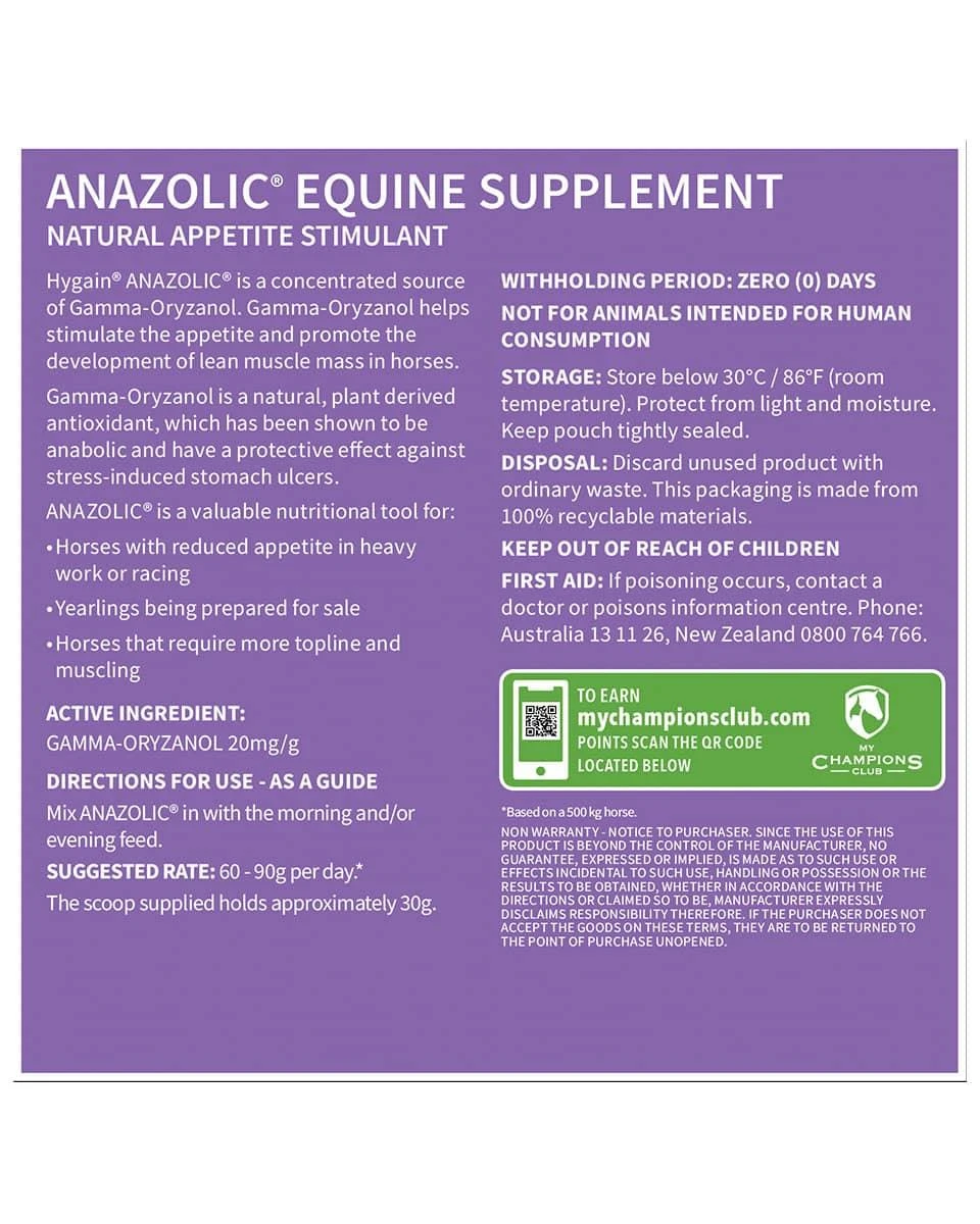 Hygain Anazolic is a natural appetite stimulant to support lean muscle development. It contains a concentration of Gamma-Oryzanol which is a plant-derived antioxidant from rice bran. Gamma-Oryzanol is proven to be anabolic, aiding in the development of muscle as well as giving protection against stress-induced ulcers. Hygain Anazolic is a great supplement for horses in hard work, young horses prepping for a sale, or any horse that may need topline and muscle support.