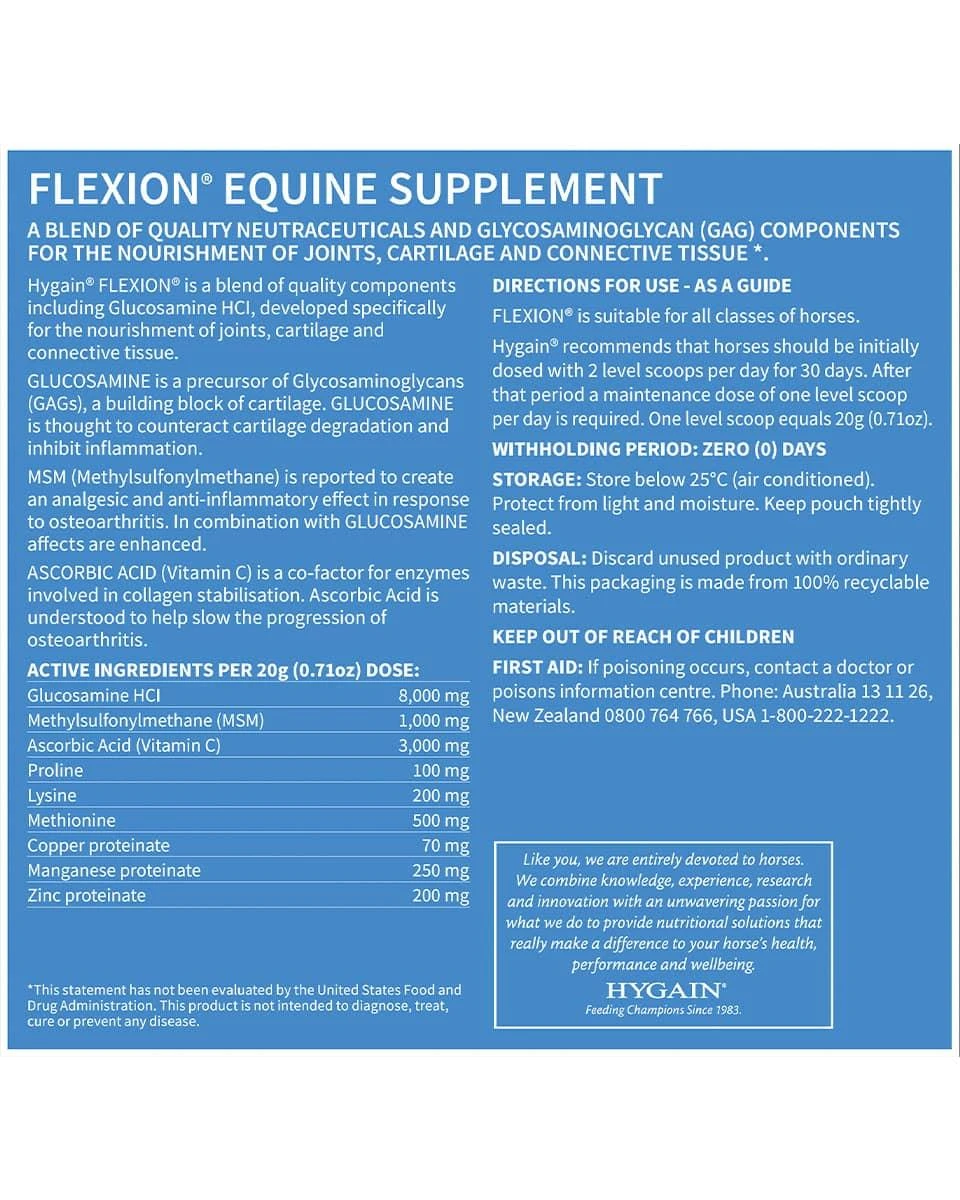 Hygain Flexion is a joint supplement that nourishes and supports the proper function of joints, cartilage, and connective tissues. It contains Glucosamine HCI which is a highly absorbable component of glycosaminoglycan. It also contains the amino acid Proline, which aids in the production of collagen for cartilage, as well as MSM and Ascorbic Acid (vitamin C). Together, the ingredients of this supplement stimulate the production of substances required for joint synthesis and proper functioning.