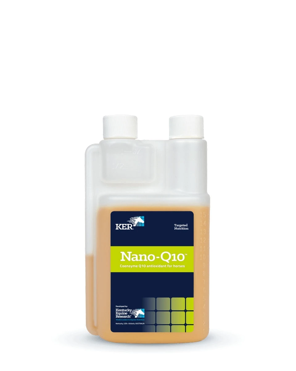 Nano-Q10 made by Kentucky Equine Research contains a powerful antioxidant called coenzyme Q10. Coenzyme Q10 is naturally occurring nutrient in the body. It acts as an antioxidant, which protects cells from damage as well as playing an important role in metabolism. Nano Q-10 can help improve aerobic energy generation as well as improving muscle recovery and integrity following exercise. Nano-Q10 is specially formulated to be highly bioavailable for maximum absorption.