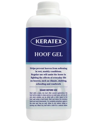 Keratex Hoof Gel from Penleigh Irving Ltd prevents stops damage caused by ammonia and water when applied on a regular basis. The Ultimate All Year Protection For Hooves. Not a damaging oil, but a powerful hydrophobic treatment that leaves the hoof glistening dry. While Keratex Hoof Hardener repairs damage to the hoof horn’s molecular structure caused by water and ammonia, Keratex Hoof Gel quite simply stops the damage from happening in the first place.Â