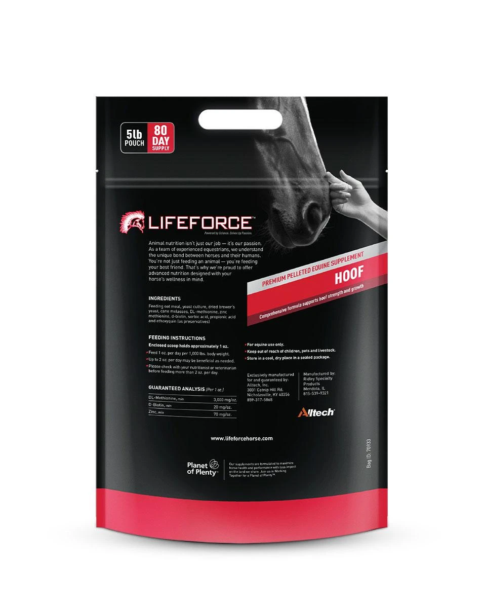 LifeForce Hoof Equine Supplement from Alltech helps enhance the skin, coat, and hoof quality of your horse. Packed with yeast cultures and organic zinc that helps support superior nutrient absorption.Â