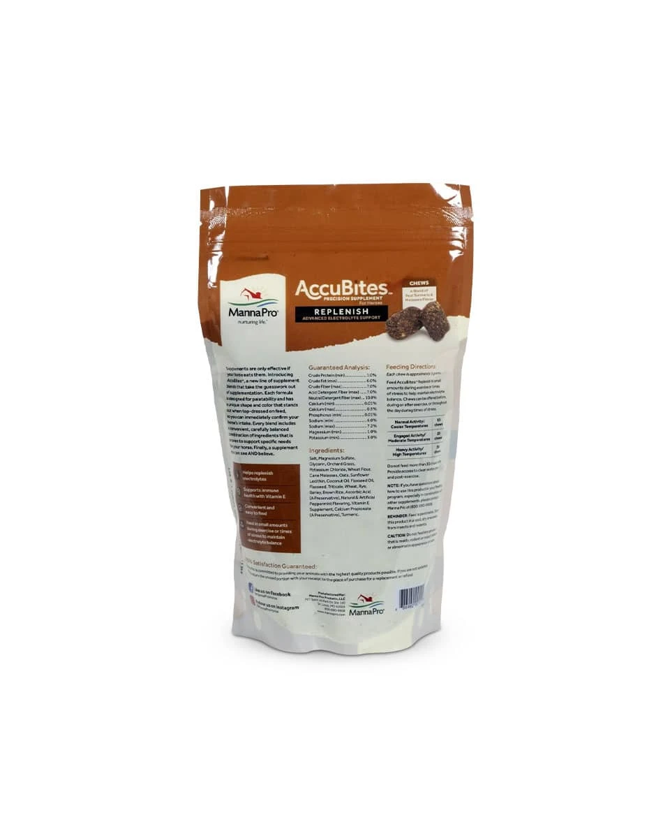 Manna Pro AccuBites Replenish is a convenient, carefully balanced combination of electrolytes and Vitamin E for immune health and electrolyte support for your horse during times of stress and physical activity.
