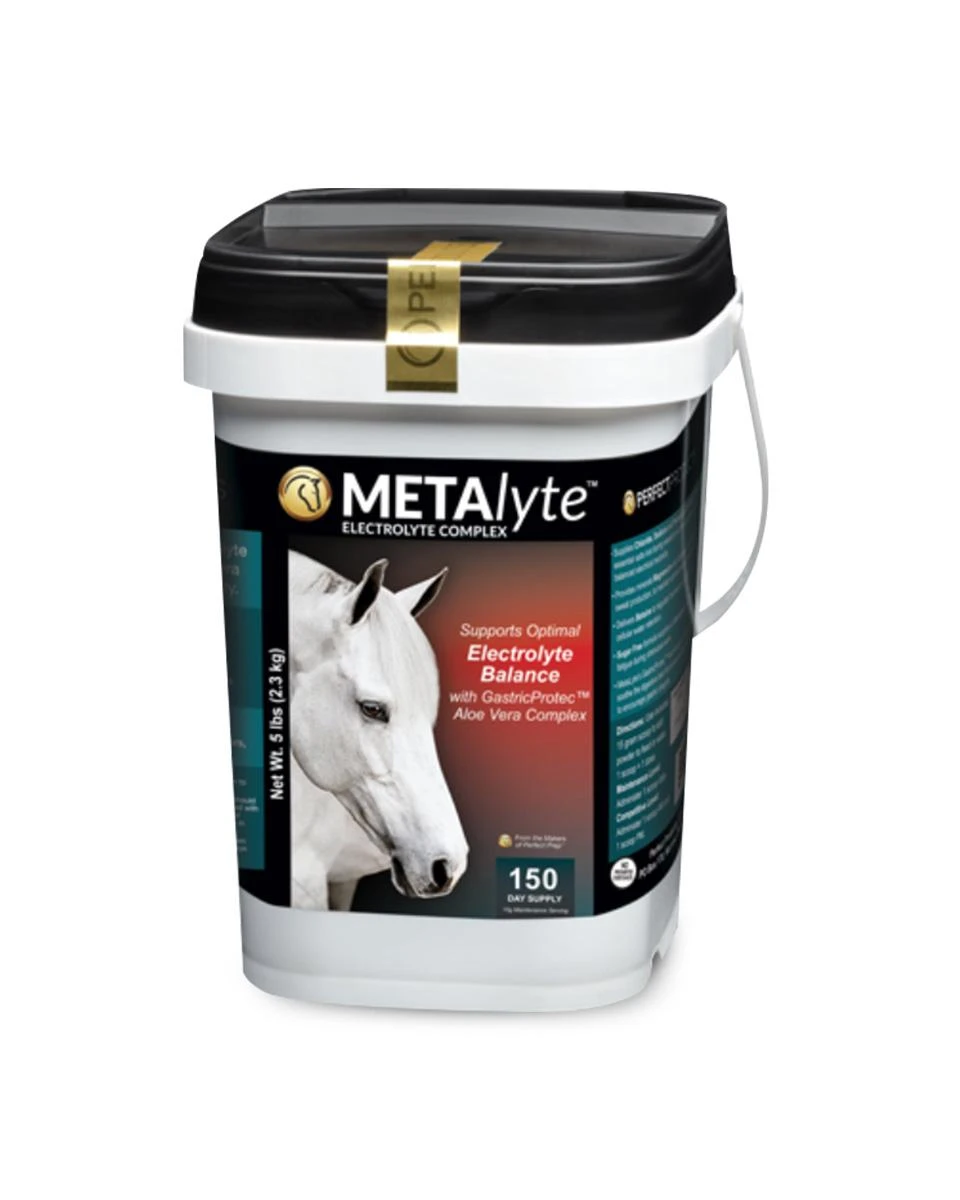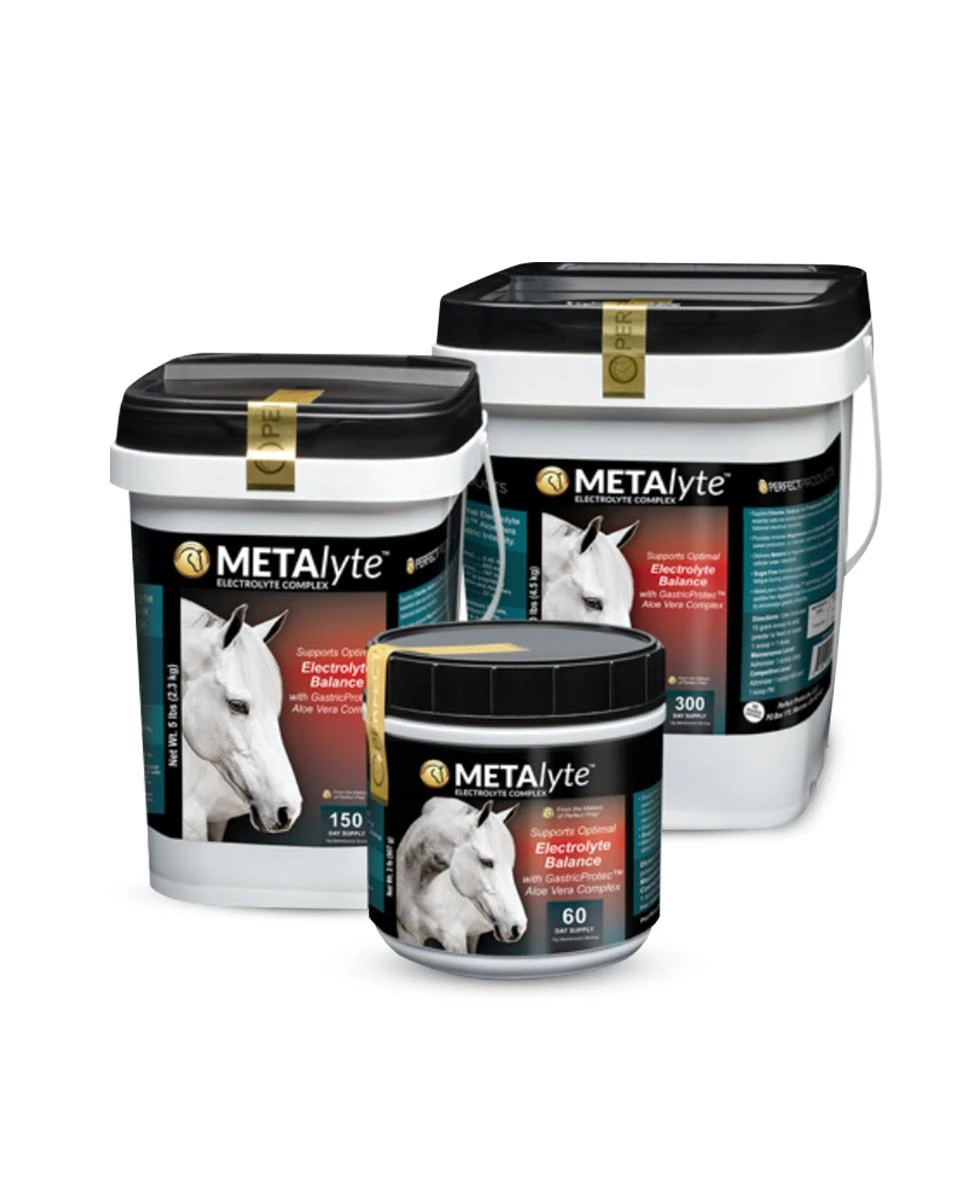 MetaLyte from Perfect Products is a powerful electrolyte powder designed without sugar or dyes. For horses prone to ulcers or with sensitive stomachs, the addition of Aloe Vera to the formula helps soothe the gastric lining. MetaLyte contains no prohibited substances, and is extremely palatable for picky eaters.