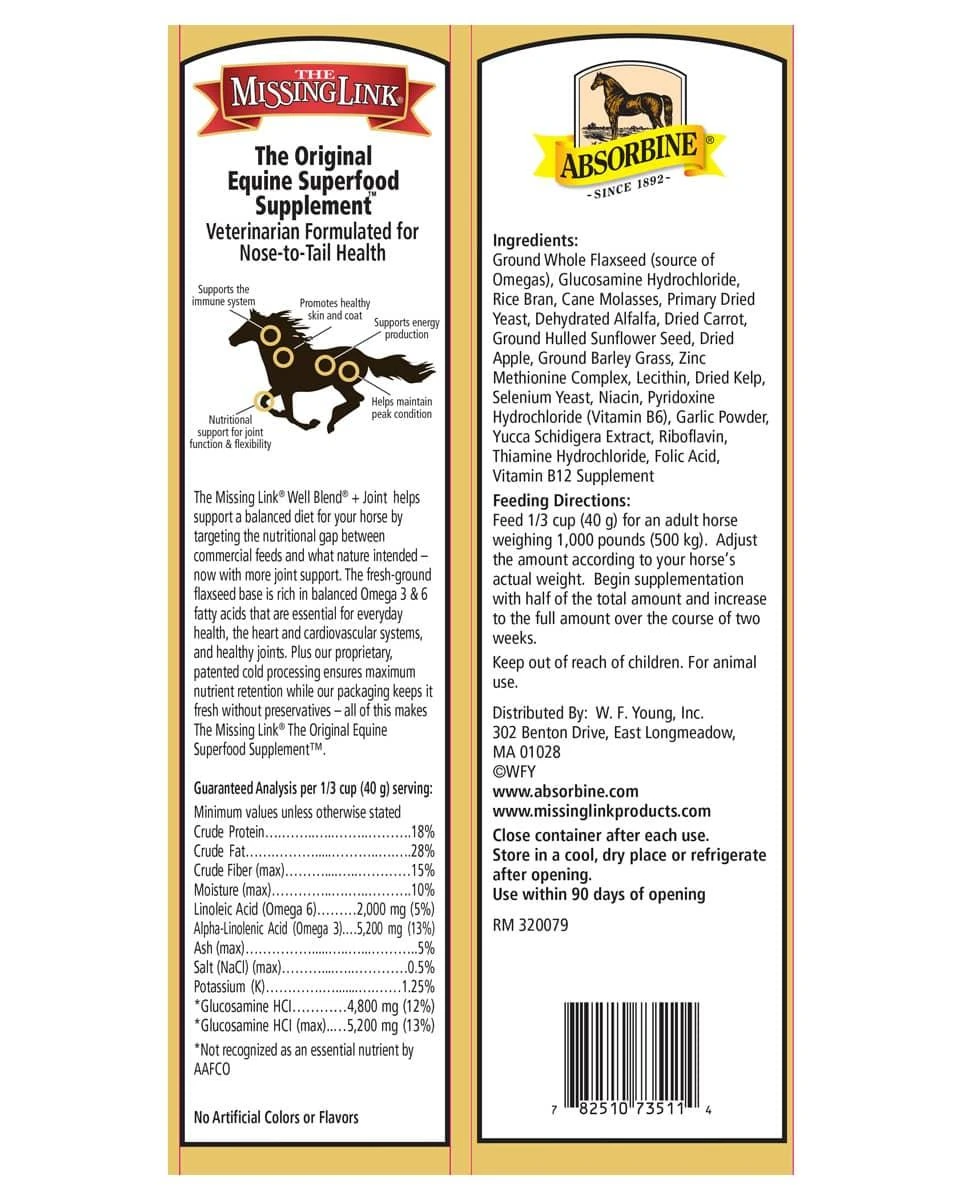 Well Blend + Joint for Horses by Missing Link is an inclusive supplement to help with overall well-being plus added joint support for your horse. The combination of glucosamine and fatty acids provides your horse with the essentials to keep its joints feeling great. In addition, this formula supports healthy coat and digestion without the use of fillers, preservatives, artificial coloring, or artificial flavoring.Ā