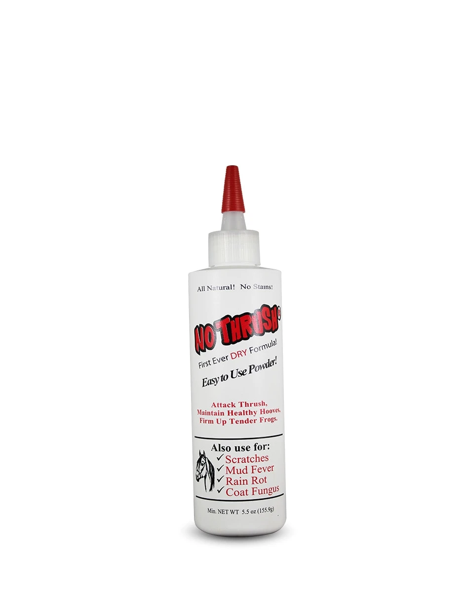 No Thrush is the first ever “DRY” approach to thrush treatment. It’s Safe, All-Natural formula is “dusted on” with a thin-tipped squeeze bottle, which provides excellent coverage of the infected area. The ingredients have been ground into a fine powder. It coats the area of the infection just as flour coats and stays on your hands while baking. No Thrush finds the damp, deep-in places that wet products cant find. Ā Won’t burn your horse’s tender tissue with chemicals!