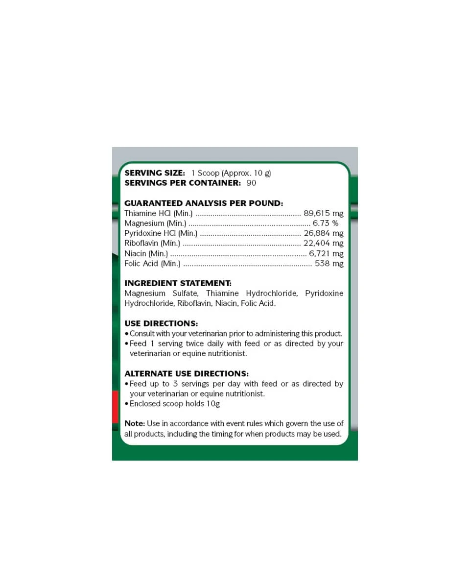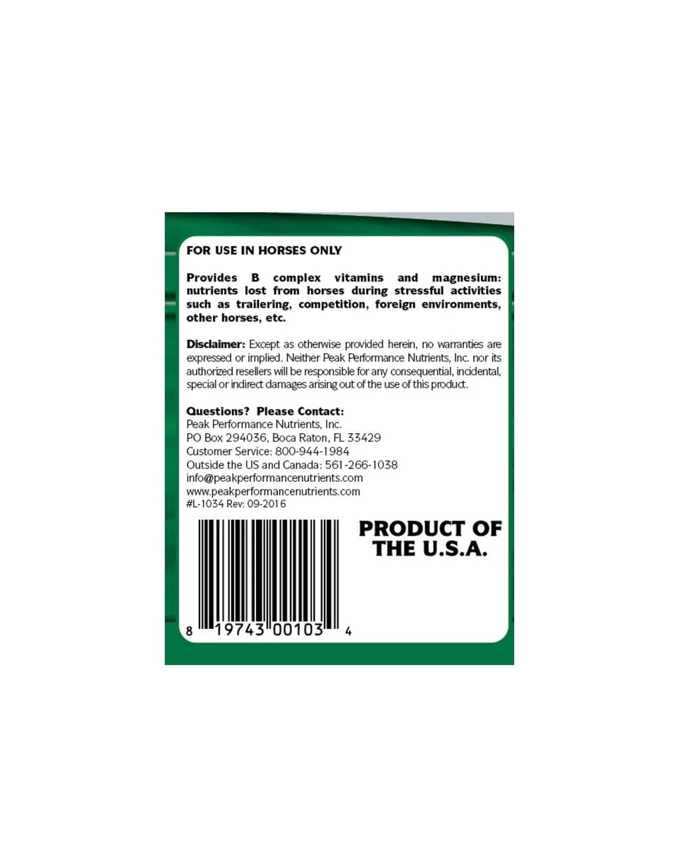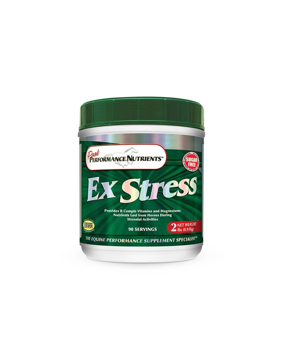 Ex-Stress made by Peak Performance Nutrients is a natural calming supplement that will not test making it safe to use the day of an event. Performance and racehorses can often become irritable, nervous and have unpredictable behavior, particularly when placed under stress at competitions and under heavy training regimens. Ex-Stress combines B Vitamins and Magnesium to reduce anxiety without creating a drowsy horse.Â