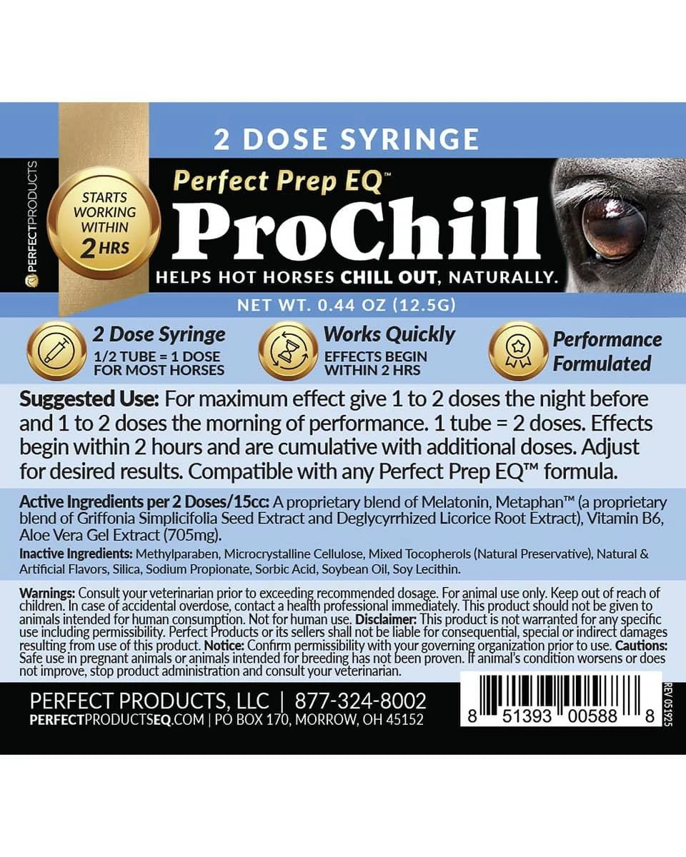 Perfect Prep EQ Pro Chill Concentrated Paste from Perfect Products is formulated to give your horse the focus they need in unfamiliar conditions and provide them the same calm they feel at home. The easy-to-administer 15cc syringe works within 2 hours and lasts up to 8. Pro Chill is formulated to flow smoothly and begin working quickly and has a soothing gut additive with Aloe Vera and DGL to avoid gastric upset. It doesn’t contain L-Tryptophan and does not contain prohibited substances.