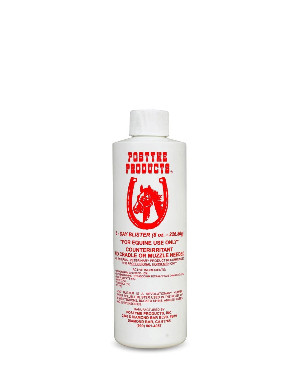 5-Day Blister by Postyme is a water soluble blister that is used to aid in the healing of bucked shins, bowed tendons as well as knee and suspensory injuries in horses. This humane formula does not require the horse to wear a cradle or a muzzle.Â