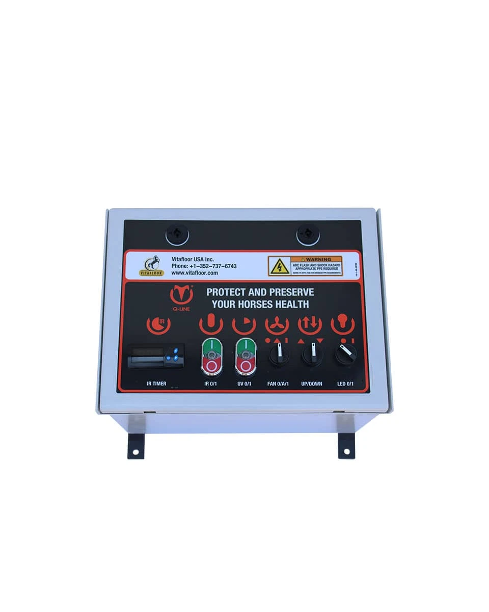The Q-Line MaXuSS Equine Solarium from Vitafloor is a warm-up option for your horse that utilizes infrared or infrared and UV heat to increase circulation and support the whole-body health of your horse. This Solarium can be purchased with either just the infrared lamps or with UV light incorporated. Ultraviolet spectrum light has many additional benefits including improved skin and coat health. The MaXuSS solarium is also great for speeding up drying times and boosting your horse’s vitamin D3 production. It’s compact, and the panels can be set at adjustable angles to help you target specific muscle groups or areas of injury. At Vitafloor, safety is a priority. That’s why the solarium is built with the highest specifications of heat-resistant, reinforced plastic, and has rounded edges to reduce any risk of injury. Add an electric lift to make this unit fully adjustable and to preserve the other functions of the grooming stall or wash bay you install it in.Â
