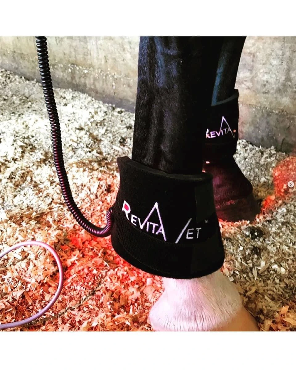 The RevitaVet IR2 from RevitaVet Therapy Systems is a wearable, class 2 laser offering red-light and infrared light therapy for your horse to promote healing for skin lesions and soft tissue injuries. Light therapy with infrared diodes offers many benefits, most notably that it stimulates the release of Nitric Oxide from hemoglobin in the bloodstream. This happens locally when light therapy is applied, and blood flow increases at the same point. Many beneficial chemical reactions happen at the cellular level when the light is applied, which all promote increased healing times. Increased Nitric Oxide in the body increases the body’s anti-inflammatory response, tissue regeneration, and pain reduction. The IR2 comes with a rechargeable battery that lasts for multiple treatments. It will cycle through 7 different frequencies or allow you to set 5-minute increments on specific frequencies, making this a very customizable option for your barn. The unit will come with program suggestions depending on the type of preventative therapy or injury your horse is recovering from. Best of all, light therapy works complimentary to many other therapy modalities, including PEMF. Use this in between stronger laser sessions from your veterinarian to increase the therapeutic benefits your horse is receiving, giving them the best opportunity to recover.