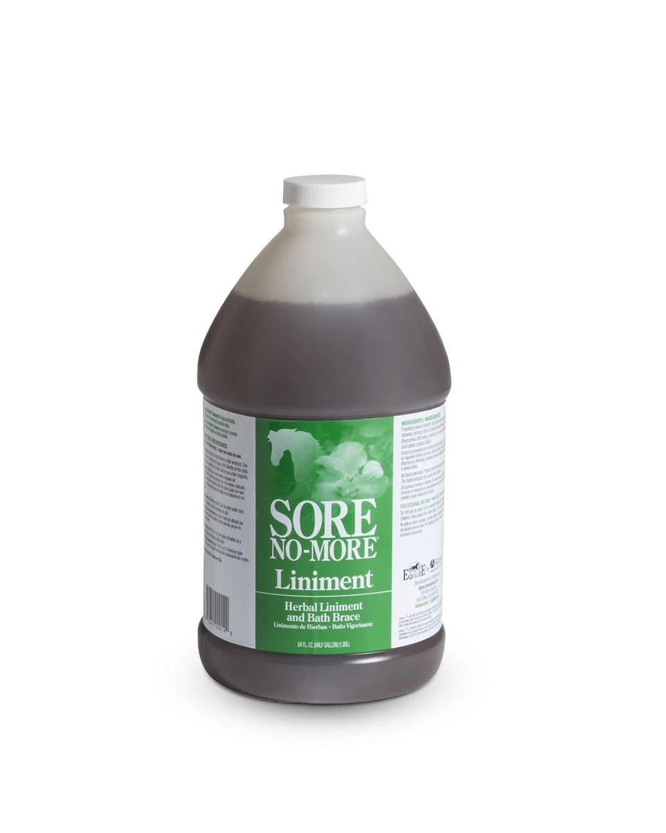 Sore No-More Liniment from Arenus is a herbal liniment made of Arnica and other herbs in a Witch Hazel base that contains no harsh chemicals making it safe for your horse. Great to use as a leg brace, before or after exercise, or as a bath brace after exercise. Since it contains no oils, it may be used as a massage liniment prior to exercise. Great for horses that may be sensitive to chemically based liniments.Â
