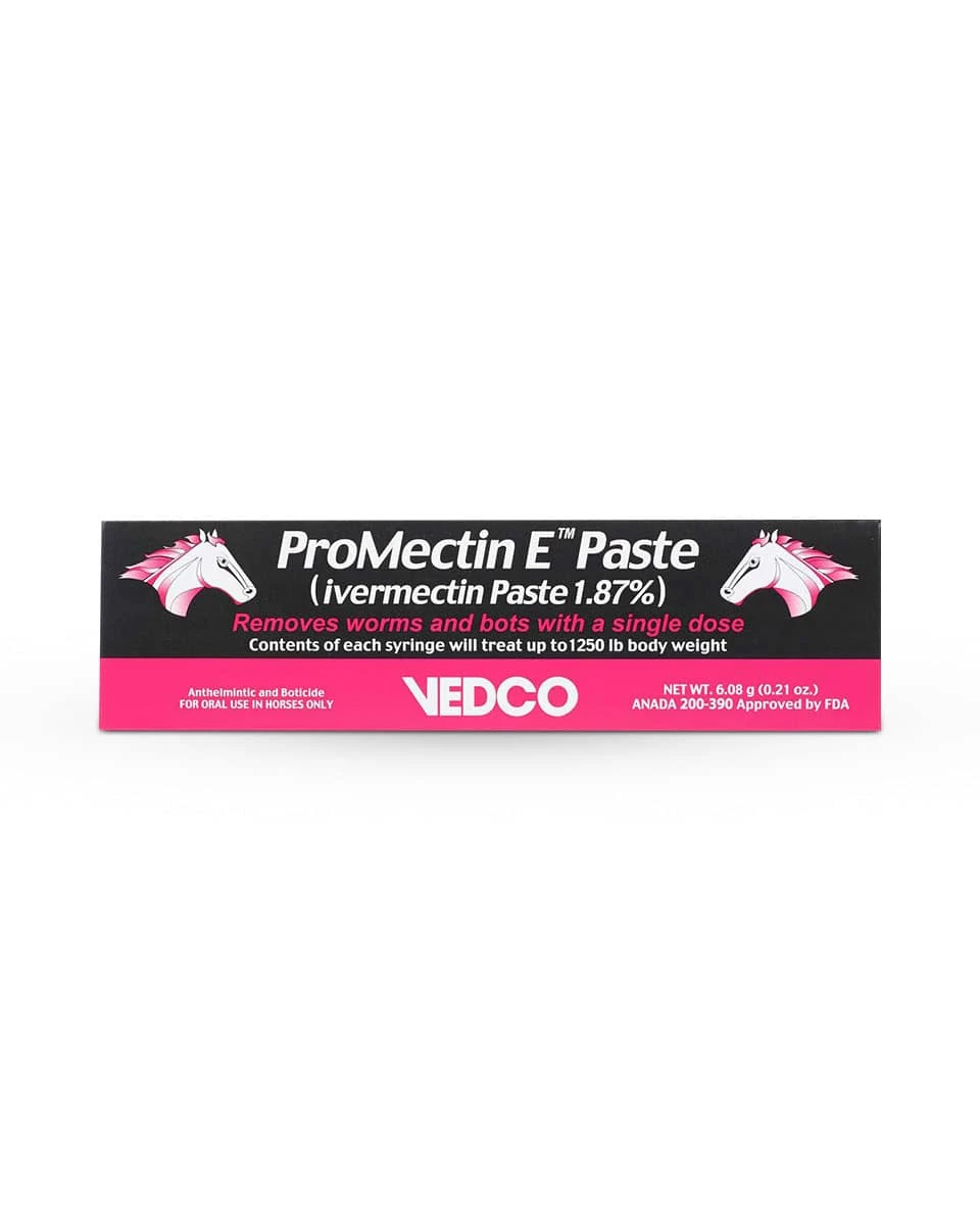 VedCo ProMectin E Paste (Ivermectin) 1.87% is an equine wormer designed to control bots, large strongyles, small bloodworms, roundworms, threadworms, pinworms, lungworms, and large mouth stomach worms. One syringe will treat a horse that weighs up to 1,250 lb. Ivermectin 1.87% is safe for pregnant mares, breeding stallions, and any age of foal.